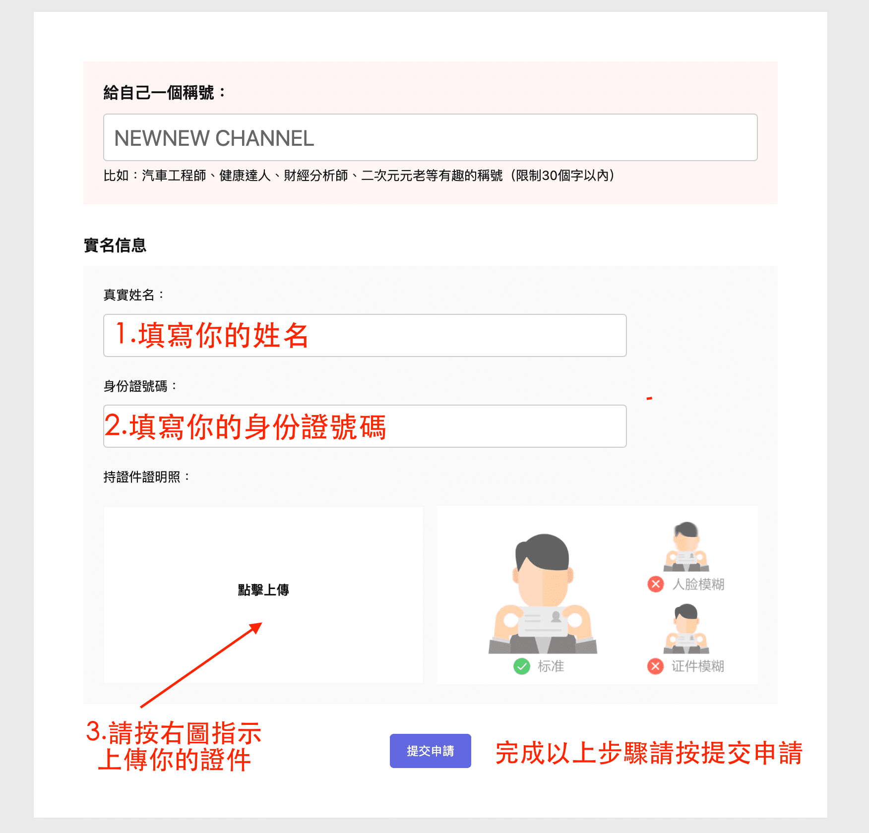 3. 請完成以下的步驟,並按提交申請。〖上傳證件相片必須是本人和證件一起拍照〗