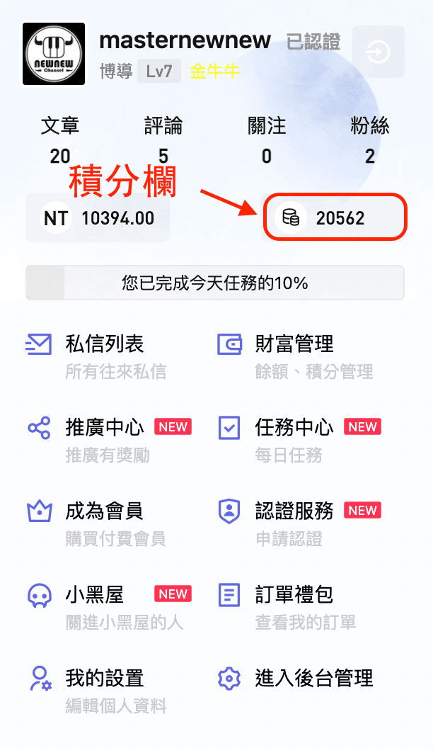 1.點選網站右上角圖標,可以觀看積分欄的顯示