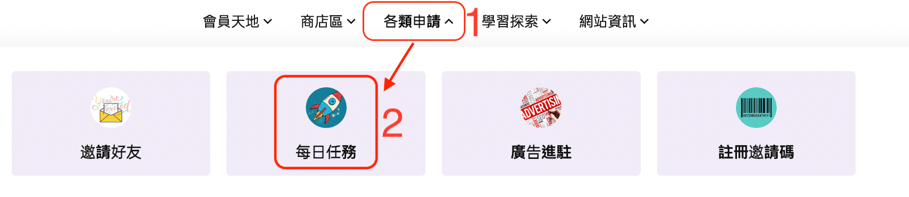2.可以到各類申請->每日任務來完成任務換取積分